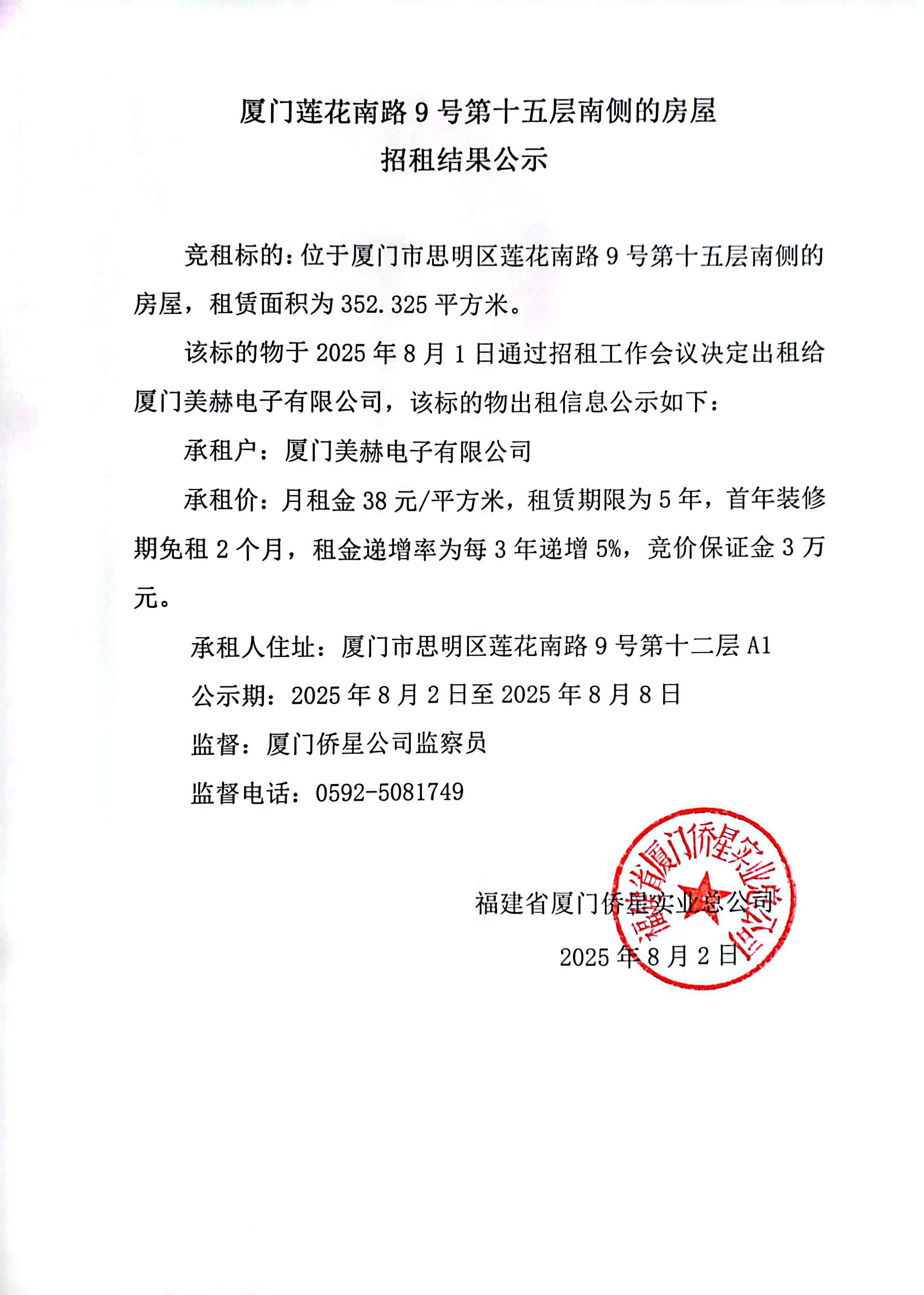 廈門蓮花南路9號第十五層南側的房屋招租結果公示